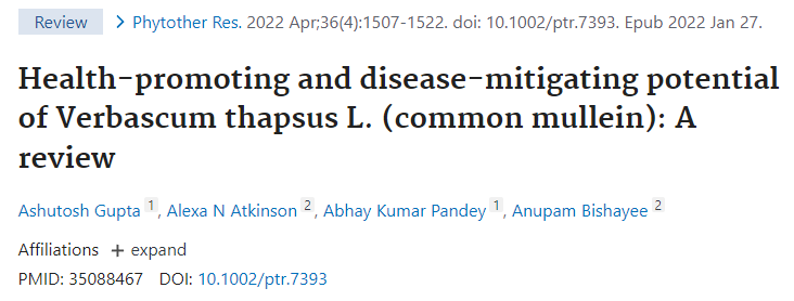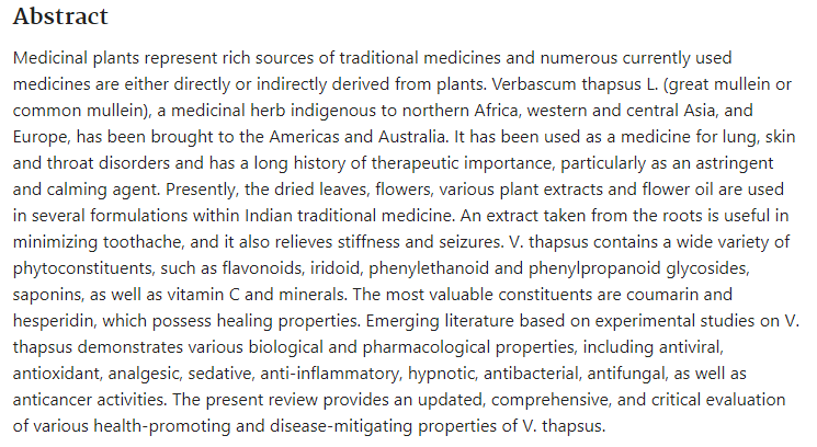 • Health-promoting and disease-reducing potential of Verbascum thapsus L. (common torch): a review: https://pubmed.ncbi.nlm.nih.gov/35088467/