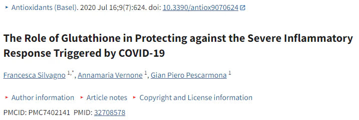 • The role of glutathione in protecting against the severe inflammatory response caused by COVID-19: https://www.ncbi.nlm.nih.gov/pmc/articles/PMC7402141/